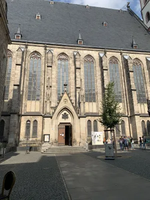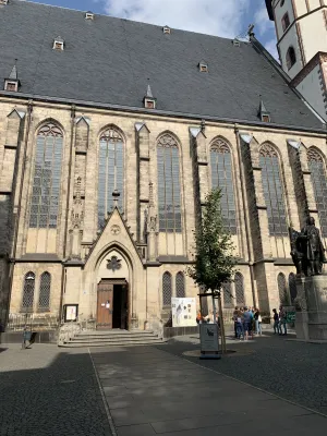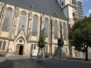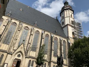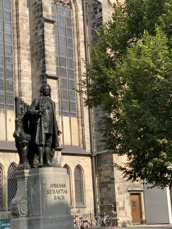 Bei meinem Besuch der Thomaskirche in Leipzig, kam ich auch am neuen Bachdenkmal, das sich direkt davor auf dem Thomaskirchhof befindet, vorbei. Dieses Denkmal des Münchner Künstlers Karl Bouché von 1895 steht vor dem berühmten Bachfenster und ist eine Hommage an den legendären Komponisten Johann Sebastian Bach, der von 1723 bis zu seinem Tod in der Thomaskirche als Thomaskantor tätig war. Das Bach-Denkmal entstand 1885 auf Initiative des Bachvereins anlässlich des 200. Geburtstags Bachs und kostete insgesamt 50.000 Goldmark, die zur Hälfte von der Stadt Leipzig und zur anderen Hälfte von privaten Spendern finanziert wurde. Für das Bach-Denkmal musste das Monument des letzten Universalgelehrten, Gottfried Wilhelm Leibniz, weichen, das sich heute im Leibnizforum, dem Innenhof der Universität Leipzig befindet. Das Bach-Denkmal besteht aus einer 2,45 Meter hohen Bronzefigur, die vom Bildhauer Carl Seffner entworfen wurde und auf einem 3,20 Meter hohen Sockel aus Muschelkalkstein des Leipziger Architekten und Stadtbaurats Otto Wilhelm Scharenberg steht. Der Bronzeguss wurde von der Firma Brückner & Noack in Leipzig ausgeführt. Dargestellt ist Bach mit geöffnetem Rock vor einer Orgel stehend mit einer Notenrolle in der rechten Hand zum Dirigieren haltend, während sich seine linke Hand gerade vom Orgelmanual zu lösen scheint. Auf der Rückseite der Orgel, die mit Jugendstilelementen verziert ist, ist ein Relief dargestellt, das an die 1902 abgebrochene, alte Thomasschule erinnert, in der sich Bachs Wohnung befand. Auf der Vorderseite des Sockels ist der Name Bachs angebracht, während auf der Rückseite die Jahreszahlen 1722 bis 1750 eingraviert sind, die an die Amtszeit Bachs als Thomaskantor erinnern. Geweiht wurde das Denkmal am 17. Mai 1908. Das Denkmal sowie das Grab von Bach im Chorraum der Thomaskirche sind zu wahren Pilgerstätten von Bach-Fans aus aller Welt geworden, die ihrem Idol durch ihren Besuch letzten Respekt zollen. Denn in der Thomaskirche fand Bach nach Überführung aus der im Zweiten Weltkrieg zerstörten Johanniskirche, seiner ursprünglichen Grabstätte, seine letzte Ruhe. Das Bach-Denkmal wird auch als neues Bach-Denkmal bezeichnet, denn was viele nicht wissen, es existiert seit 1843 in der Parkanlage am Dittrichring nahe der Thomaskirche bereits ein Denkmal für Johann Sebastian Bach. Sowohl das alte als auch das neue Bach-Denkmal sind recht repräsentativ und gedenken einem der größten Komponisten Deutschlands.