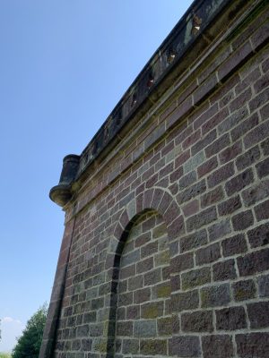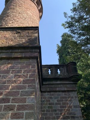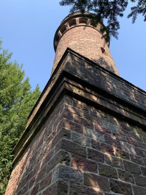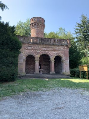 Ein kleines Lustschlösschen mit Türmchen aus rotem Neckartäler Sandstein befindet sich am Hang des Königsstuhls, einem über 560 Meter hohen Berg im Odenwald. Dieses märchenhafte Kleinod stiftete der Heidelberger Stadtrat und Pharmazie Professor Dr. Louis Posselt seiner Nachwelt. Testamentarisch hielt er fest, dass nach seinem Tod ein „Aussichthürmchen und Lusthäuschen“ errichtet werden sollte. So entstand nach Posselts Ableben ein im Stil der Frührenaissance schmaler Turm mit offener dreibogiger Vorhalle und Aussichtplattform, der perfekt als Kulisse für zahlreiche Ritterfilme genutzt werden könnte. Posselt, der 1817 in Heidelberg geboren wurde, verbrachte nach dem Scheitern der Badischen Revolution 10 Jahre im Exil in Mexiko. Dort arbeitete der gelernte Pharmazeut als Minensachverständiger. Nach seiner Rückkehr in seine alte Heimat, wurde er 1860 in Heidelberg zum Professor für Pharmazie berufen. Zudem trat er in die Fußstapfen seines Vaters und wurde Stadtrat. Das Lustschlösschen entstand nach den Plänen des Heidelberger Stadtbaumeisters Gustav Schaber und wurde am einjährigen Todestag seines Stifters am 21. August 1881 eingeweiht. In den Jahren von 2008 bis 2009 nahm die Stadt Heidelberg aufwendige Sanierungsarbeiten vor, die von der „Deutschen Stiftung Denkmalschutz“ finanziell unterstützt wurden. Dieses kleine Lustschlösschen mit Aussichtsturm, die sogenannte Posseltslust, benannt nach ihrem Stifter, besuchte ich bei tropischen Temperaturen. Idyllisch am Heidelberger Stadtwald gelegen konnte ich dieses Bauwerk das zur Erholung und Besinnung erbaut wurde, aus nächster Nähe betrachten. Nachdem ich einen mit Kies ausgeschütteten Vorplatz überquert hatte, kam ich zur Vorhalle mit ihren drei Rundbögen und einen runden, steinernen Tisch im Zentrum. Dahinter entdeckte ich den Eingang zum 15 Meter hohen Rundturm. Eine Wendeltreppe führt sowohl zur Terrasse auf dem Flachdach der Loggia als auch zur Plattform auf den Turm, die durch eine Sandstein-Rüstung mit schlüssellochförmigen Zieröffnungen gesichert sind.