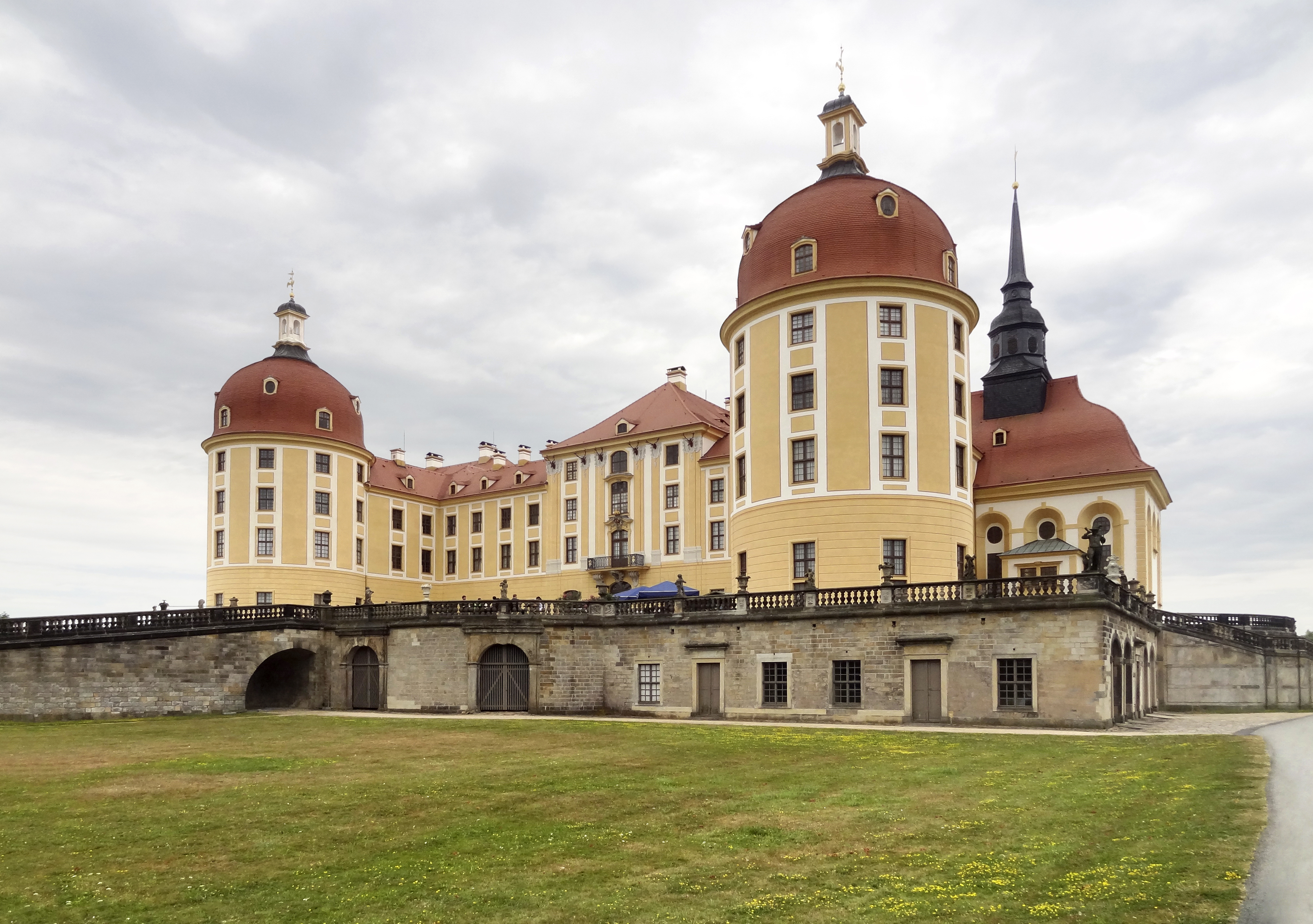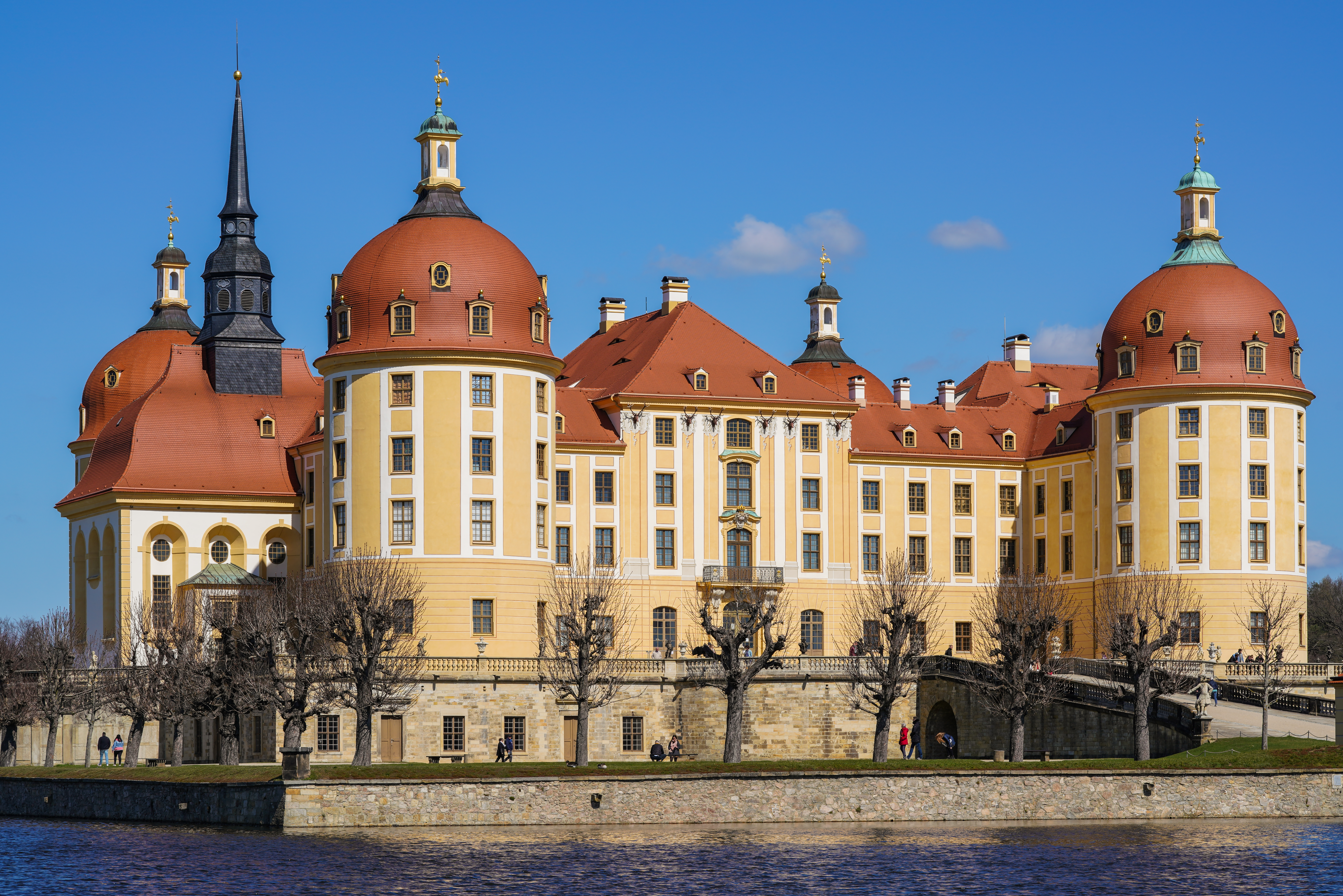 Eine barocke Umgestaltung. Unter der Herrschaft von August dem Starken wurde Moritzburg von 1722 bis 1730 einer umfassenden barocken Renovierung unter der Leitung von Matthäus Daniel Pöppelmann unterzogen. Diese Umgestaltung umfasste den Abriss der Hofmauern, eine erhebliche Erhöhung und Erweiterung des zentralen Gebäudes sowie die Integration von Flügelgebäuden mit Ecktürmen. Umgeben von Terrassen, Rampen und Brücken stand das Schloss majestätisch inmitten neu angelegter Teiche und Tiergehege und verkörperte die Pracht des Dresdner Barockstils. Auch die Schlossgärten entwickelten sich weiter, beeinflusst von der geometrischen Präzision der französischen Landschaftsgestaltung. Obwohl sie aufgrund des Todes Augusts unvollendet blieben, bildeten diese Gärten eine malerische Erweiterung der Pracht des Schlosses und fügten sich nahtlos in die umgebende Wildnis ein.