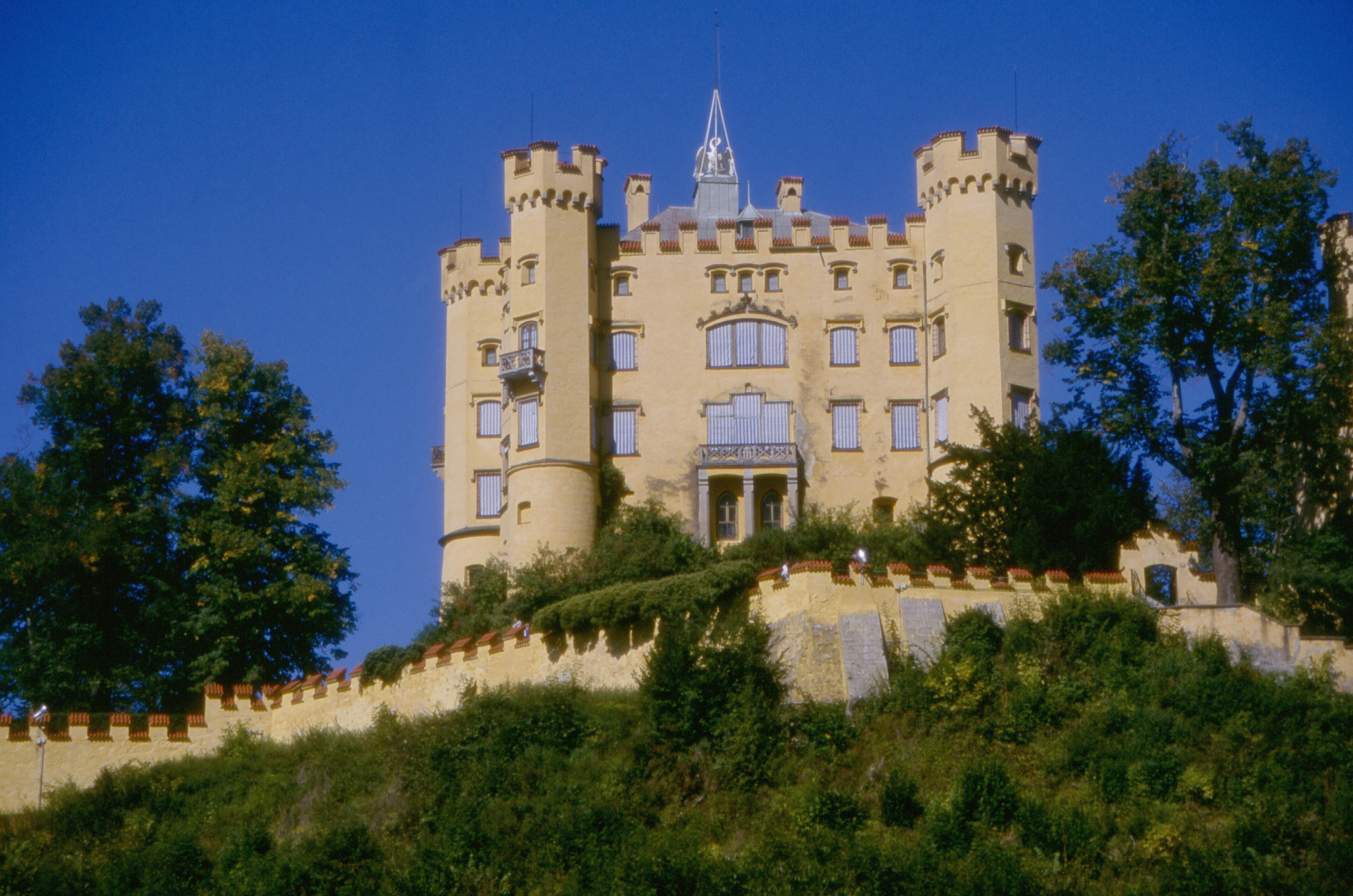 Eine königliche Verwandlung – Der Wendepunkt für Hohenschwangau kam 1832, als Kronprinz Maximilian von Bayern die verfallenen Überreste kaufte und ein ehrgeiziges Wiederaufbauprojekt in Angriff nahm. Unter Maximilians Vision wurde das Schloss einer vollständigen Verwandlung unterzogen, die von Domenico Quaglio, einem für seine Beiträge zum Bühnenbild und zur Architektur bekannten Künstler, geleitet wurde. Die Renovierung orientierte sich an den romantischen Idealen des neugotischen Stils und bevorzugte eine Ästhetik, die die Revival-Trends anderer europäischer Paläste widerspiegelte. Maximilians Projekt fiel mit einer breiteren romantischen Bewegung zusammen, die unter dem Einfluss des Mittelalter-Revivalismus und der Faszination für das Rittertum ganz Europa erfasste. Das Innere von Schloss Hohenschwangau verwandelte sich in eine Hommage an Mythen und Geschichte, geschmückt mit Wandgemälden, die Geschichten aus der epischen Literatur wie dem Nibelungenlied und Legenden des Schwanenritters Lohengrin darstellen. Diese thematische Neugestaltung umfasste Kunstwerke von Künstlern wie Moritz von Schwind, dessen Fresken die geschichtsträchtige Vergangenheit der Region verewigten.
