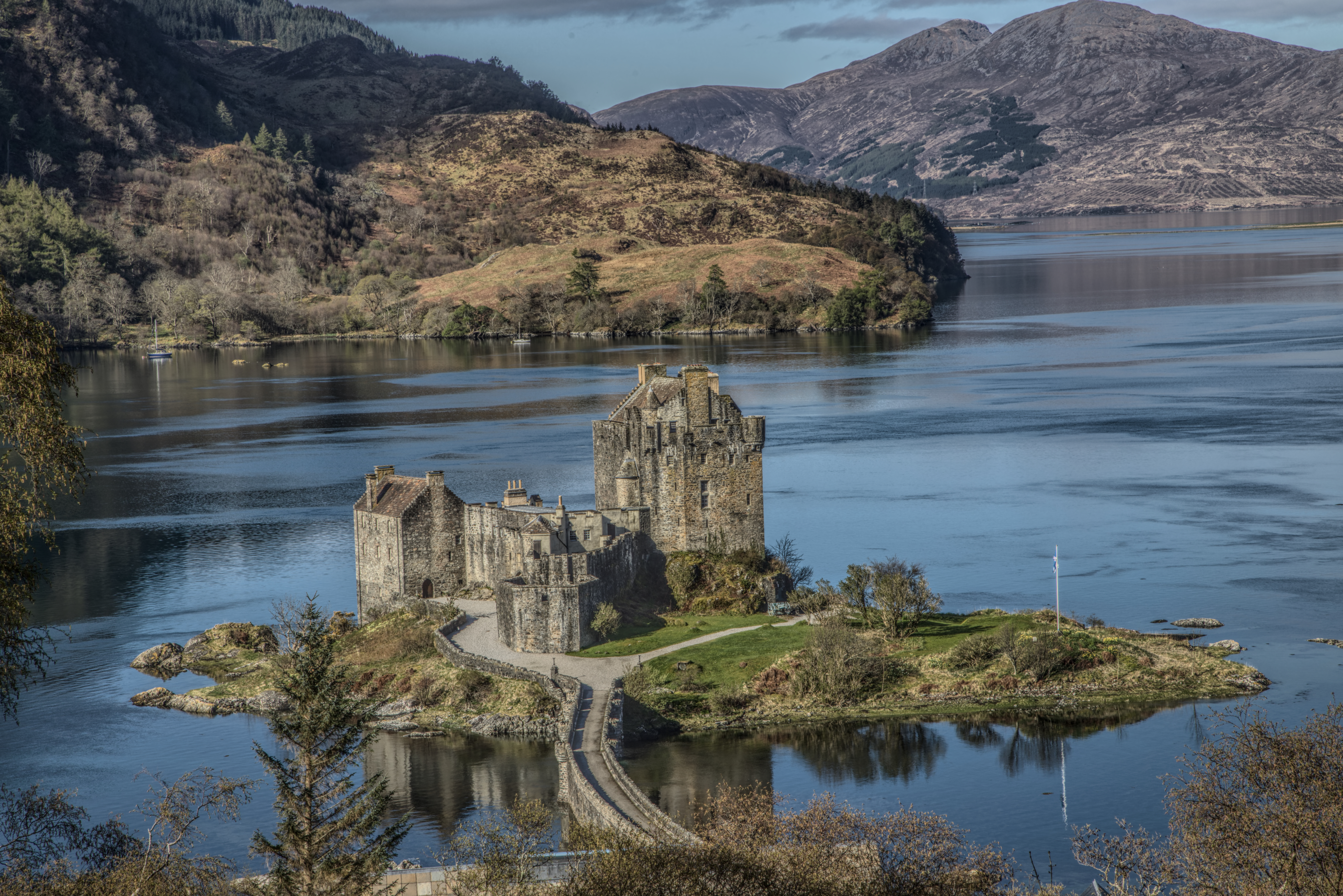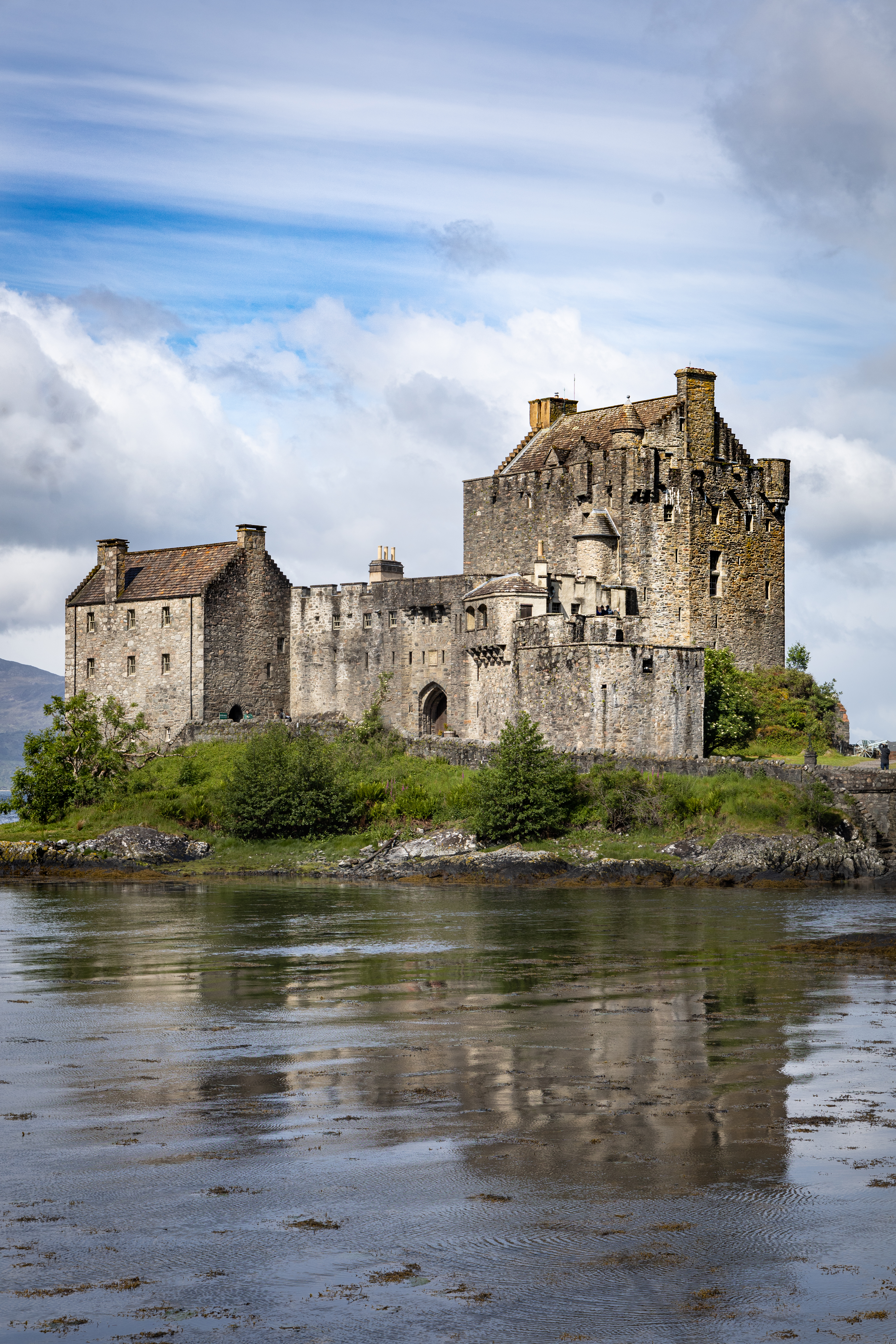 Eilean Donan Castle liegt eingebettet an der Mündung dreier Seen in den westlichen schottischen Highlands und steht als zeitloser Wächter über die geschichtsträchtige Vergangenheit Schottlands. Sein Name, übersetzt „Donans Insel”, geht auf den Heiligen Donnán von Eigg zurück, einen keltischen Märtyrer aus dem 6. Jahrhundert, dessen Geist angeblich noch immer dort weilt. Diese alte Festung in der Nähe des Dorfes Dornie verwandelt sich bei Flut in eine Gezeiteninsel, die nur über eine steinerne Fußgängerbrücke erreichbar ist, was ihren geheimnisvollen Reiz noch verstärkt.