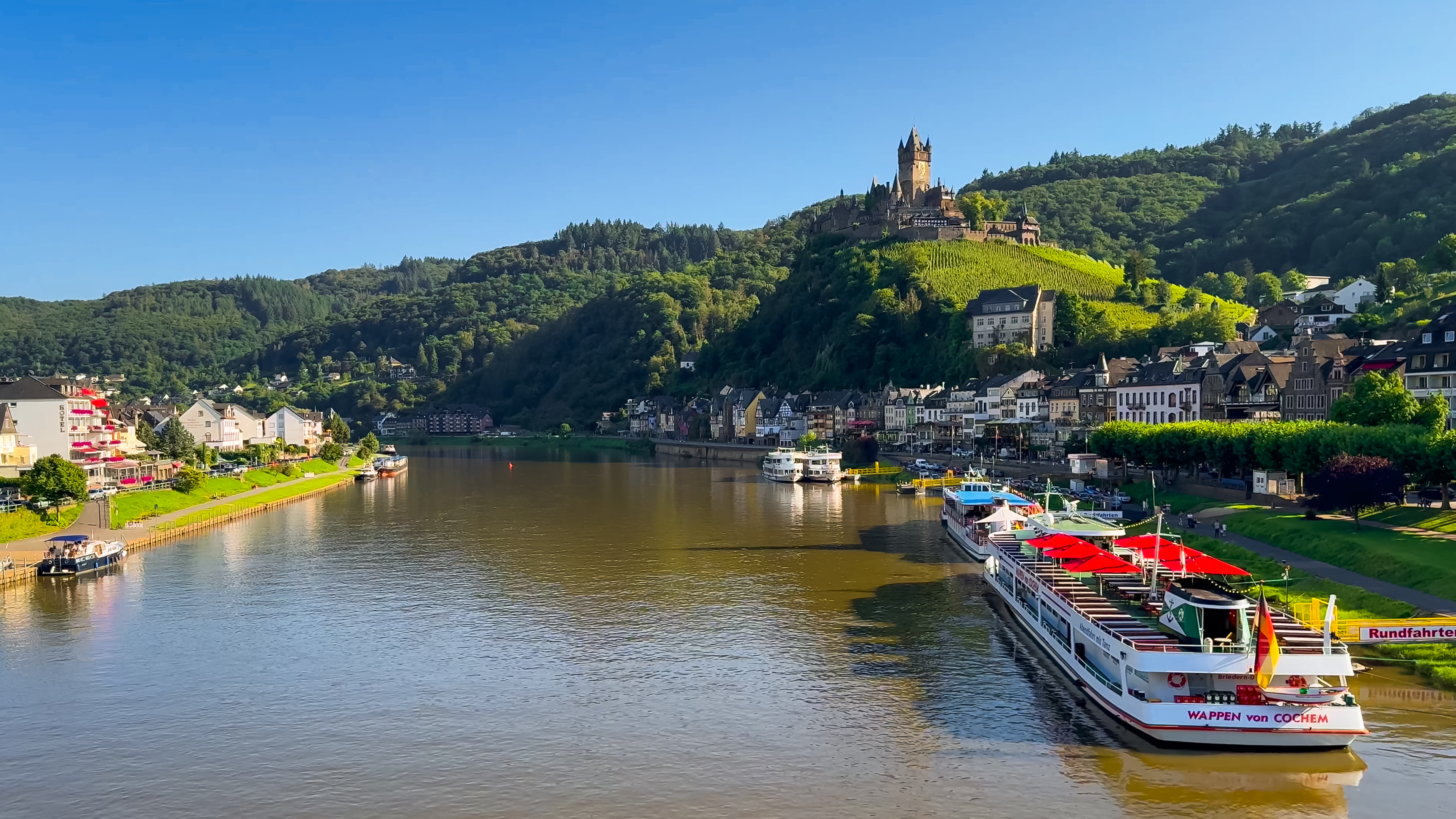 Unvergleichliche natürliche Schönheit – Über seinen historischen und kulturellen Reiz hinaus bietet Cochem einige der atemberaubendsten Naturlandschaften Deutschlands. Die Lage der Stadt an der Mosel bietet zahlreiche Möglichkeiten zum Wandern, Radfahren und für Flusskreuzfahrten. Der Apolloweg, ein beliebter Wanderweg, belohnt Abenteurer mit einem Panoramablick auf das Tal und bietet eine Perspektive, die sowohl beeindruckend als auch demütigend ist.
