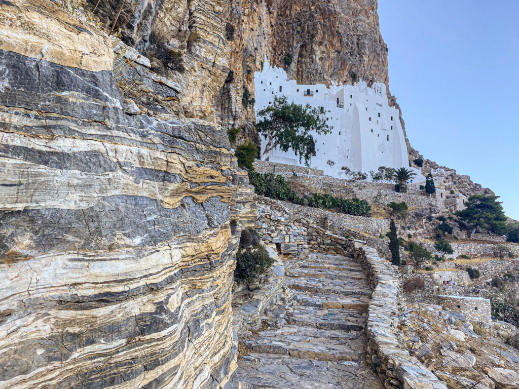 Die Geschichte dieses faszinierenden Bauwerks reicht bis ins 9. Jahrhundert zurück. Der Legende nach wurde es von Mönchen aus Palästina gegründet, die durch göttliche Führung auf die kleine Insel gelangten. Sie sollen eine Ikone der Jungfrau Maria gerettet haben, die während einer ikonoklastischen Bewegung im Heiligen Land bedroht war. Diese Ikone fand in den schützenden Höhlen von Amorgos eine neue Heimat.