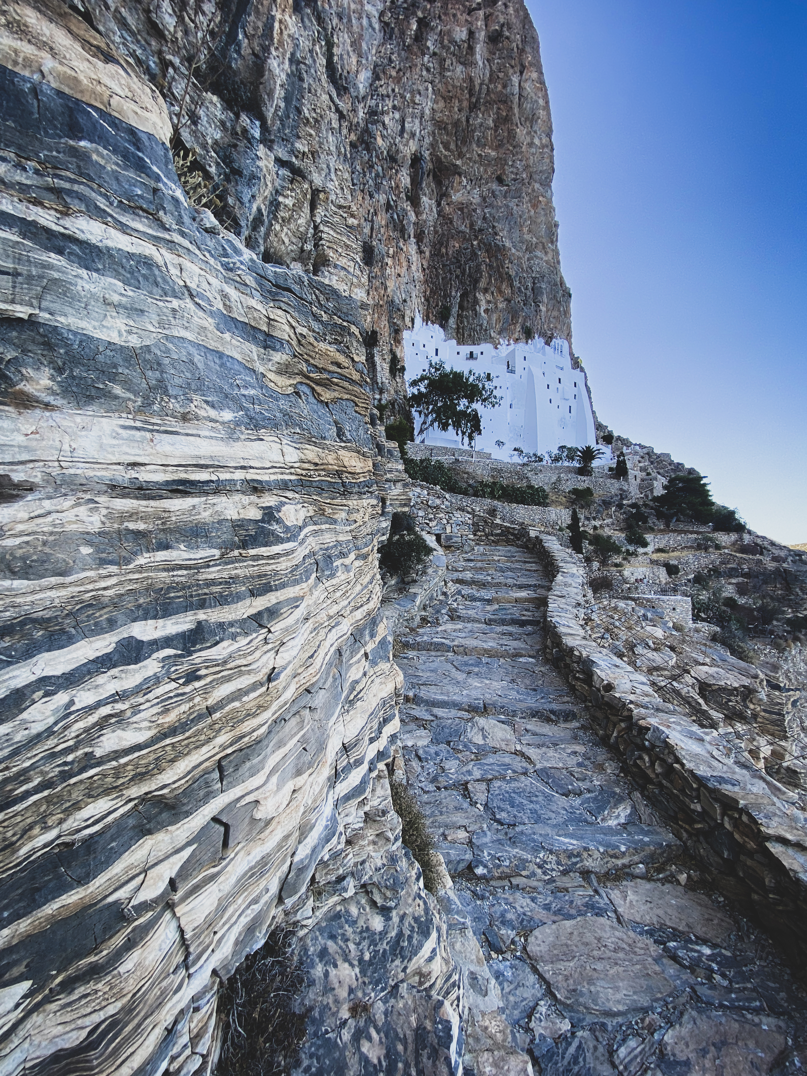 Auf den ersten Blick könnte man meinen, das Kloster sei lediglich ein weiteres architektonisches Wunderwerk der Menschheit. Doch ein genauerer Blick zeigt schnell, dass Hozoviotissa weit mehr ist als nur ein Gebäude. Mit seinen strahlend weißen Mauern, die fast nahtlos in die Felsen übergehen, scheint es mit der Natur selbst zu verschmelzen. Die steilen, felsigen Hügel bilden einen dramatischen Kontrast zum friedlichen Blau des Meeres und tragen zur mystischen Atmosphäre dieses Ortes bei.