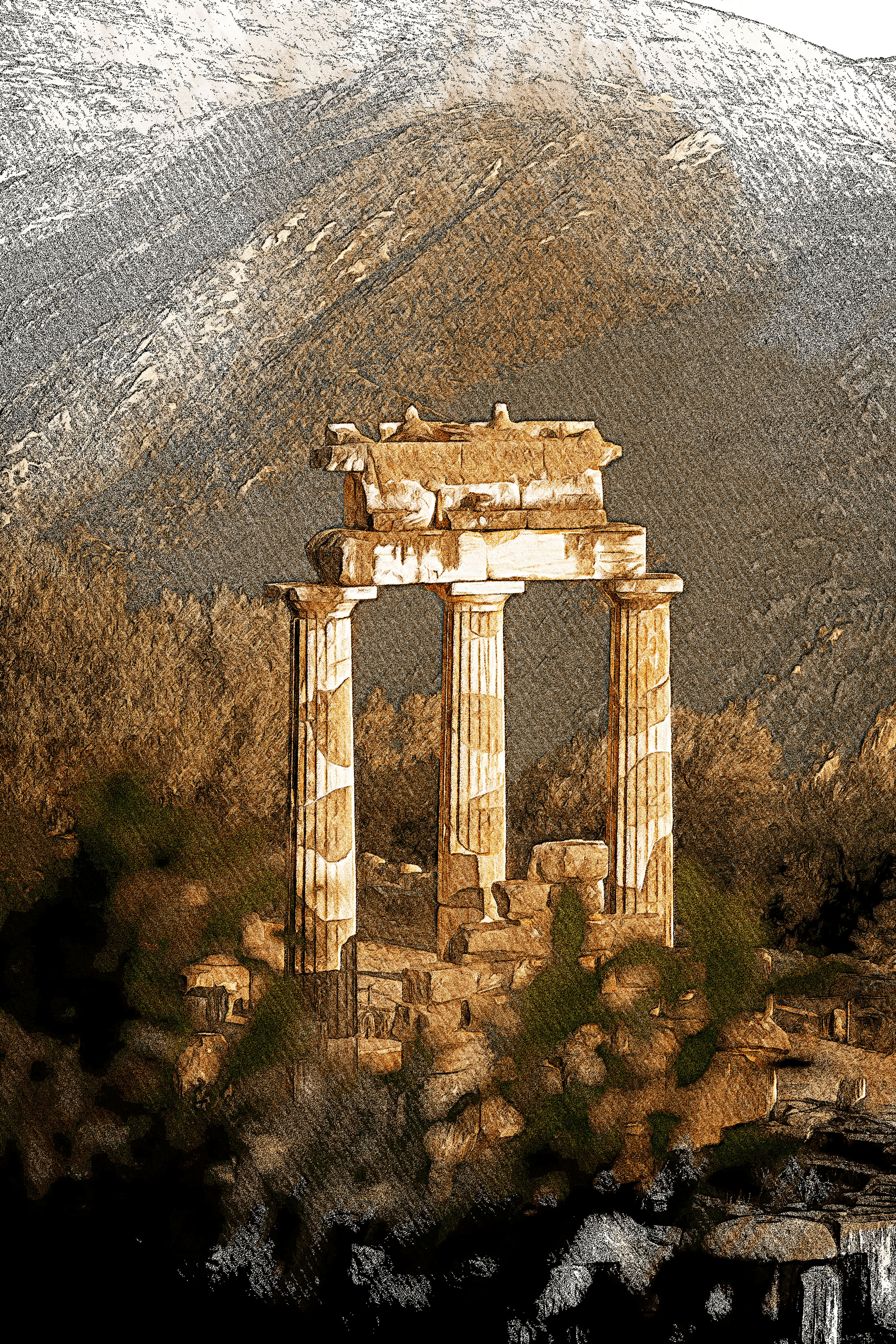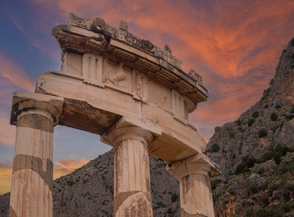 Der Geburtsort eines Mythos – Die Ursprünge des Orakels von Delphi liegen im dichten Nebel antiker Legenden verborgen. Der griechischen Mythologie zufolge war dieser heilige Ort das Zentrum der Erde, bekannt als Omphalos, der „Nabel“. Die Geschichte erzählt, wie Zeus zwei Adler von den Enden der Welt aussandte und sich ihre Flugbahnen über Delphi kreuzten. Für Zeus war dies das Zeichen, dass hier der Mittelpunkt der Welt lag. In Delphi residierte das Orakel in dem dem Gott Apollon geweihten Tempel. Priesterinnen, bekannt als Pythias, verkündeten hier ihre Prophezeiungen. Diese Frauen, die ihre Vorhersagen in Trance und unter dem Einfluss berauschender Gase machten, die aus einer Felsspalte strömten, waren zentrale Figuren im antiken hellenistischen Glaubenssystem. Der Einfluss ihrer Vorhersagen reichte weit über die Grenzen Griechenlands hinaus und prägte politische und militärische Entscheidungen sowie die Gründung von Städten.